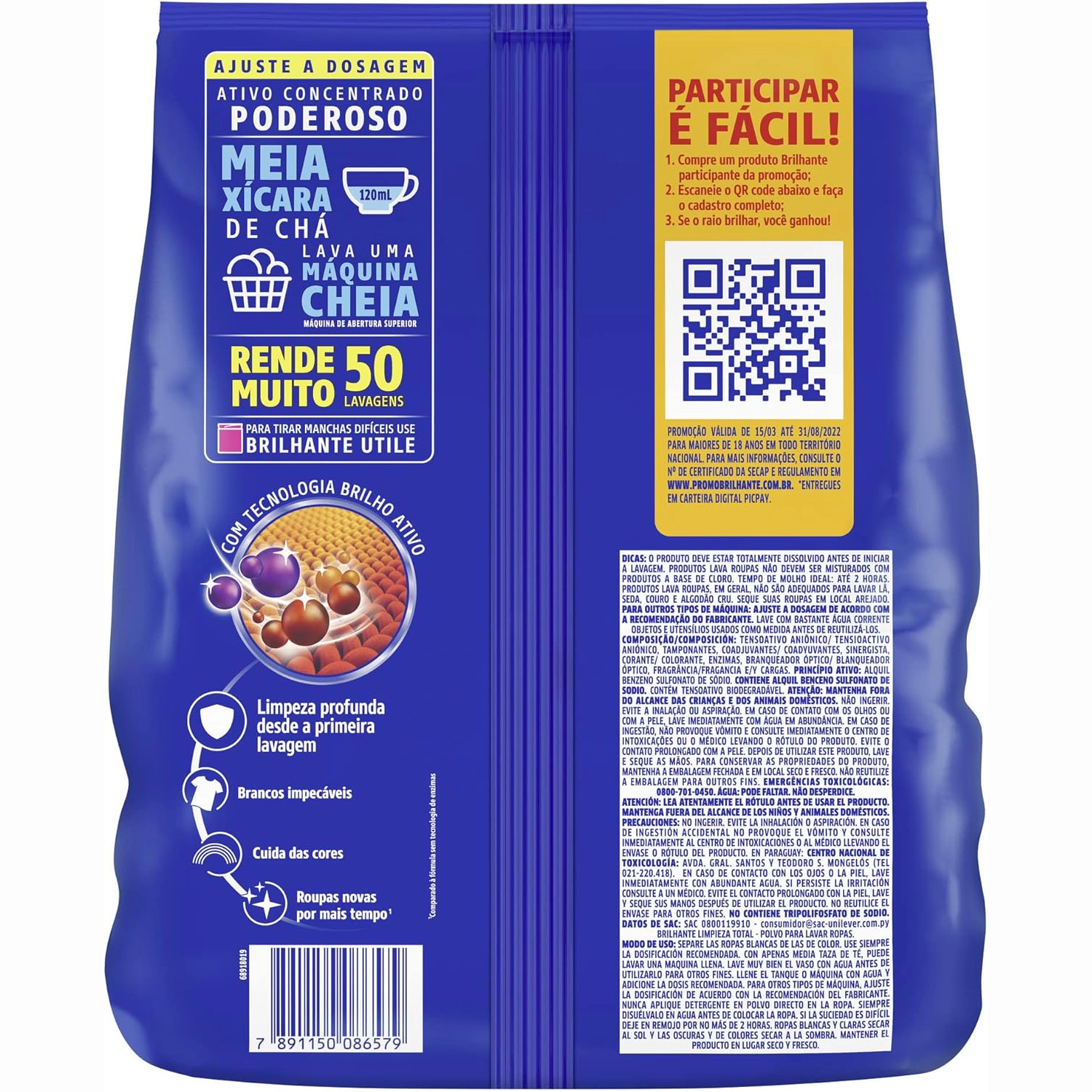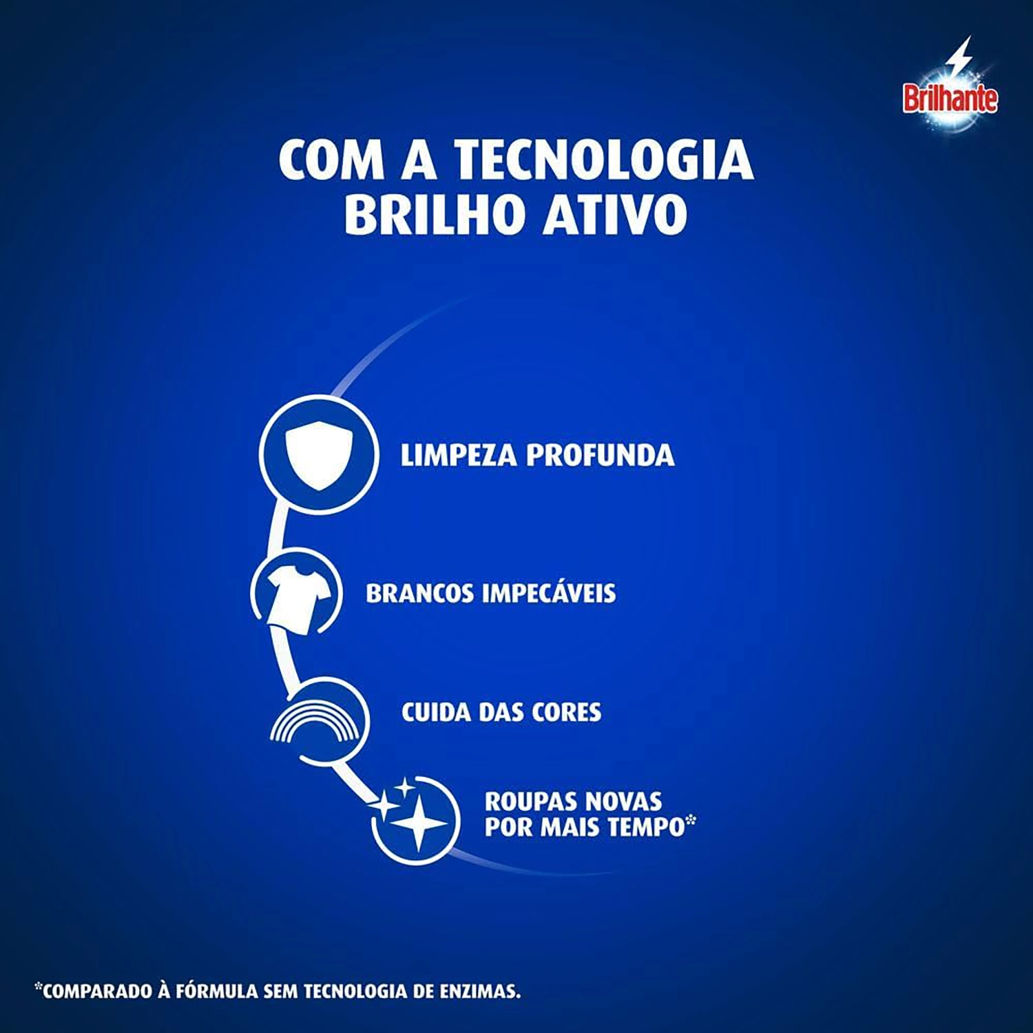 - Brilhante Limpeza Total, com sua nova fórmula que além de higienizar suas roupas profundamente, as protege cuidando das cores